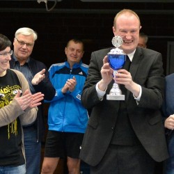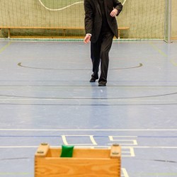Früher war Neunmeterkönig beim Turnier für „Sportler gegen Hunger“. Jetzt forderte Mitorganisatorin Marielle Mittelberg die 13 prominenten Gönner und Freunde des Klubs überraschend zum „Mega-Dart“ auf. Auf dem Hallenparkett waren mehrere Felder mit den Punkten 50, 60 und 80 aufgezeichnet. in der Mitte stand ein Kasten mit 100 Punkten. Verdeckt hinter einer riesigen Turnmatte mussten die Promis einen kleinen Sandsack dreimal in die Felder werfen. Georg Weimer, Guido Oevermann, Friedhelm Biestmann und Heiner Zumdohme kamen jeweils auf 240 Punkte und qualifizierten sich fürs Stechen. In der ersten Runde schieden Weimer und Oevermann aus, so dass es zum Showdown zwischen dem früheren Landtagsabgeordneten und dem Pastor kam, die vor dem dritten Wurf gleichauf lagen. Dann traf Heiner Zumdohme, angefeuert von der voll besetzten Tribüne, wieder die Kante des Kastens, diesmal fiel der Sandsack aber hinein ins „Bulls Eye“. 100 Punkte, der knappe Sieg. Unter riesigem Applaus überreichte Marielle Mittelberg dem äußerst sympathischen Würdenträger den Wanderpokal, der neue Hallenkönig lud seine Mitstreiter spontan zum Umtrunk in der Cafeteria ein.
