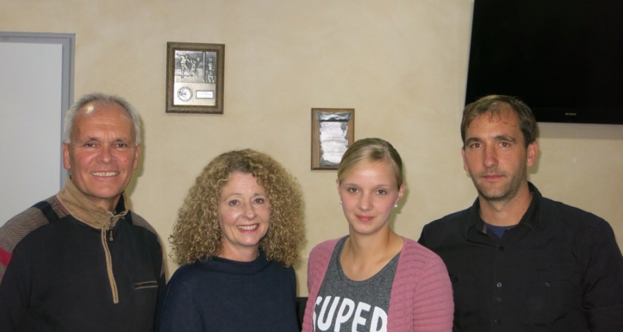 Reinhard Schwarze und Diana Maronde freuen sich den TuS Jugendleitern Theresa Escher und Sebastian Gude die Spende der Plattenspeelers Neuenkirchen zu überreichen.