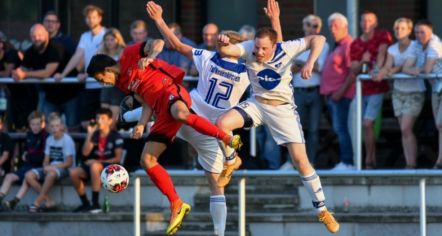 Ein Trio hebt ab: Der Dammer Tobias Schütt (links) im Luftkampf mit den Neuenkirchenern Ian Henkenberens (Nr. 12) und Benedikt Herms-Westendorf.