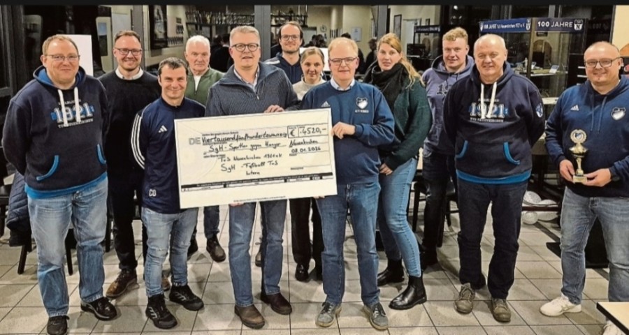 Starke Truppe, großer Scheck: Neuenkirchens Orga-Team am Donnerstag beim Abschlusstermin für die „Champions League für SgH“.