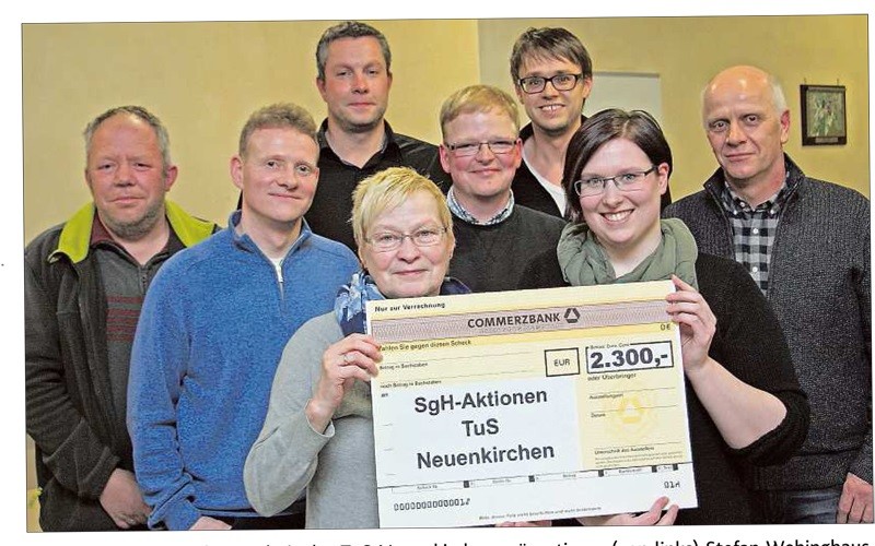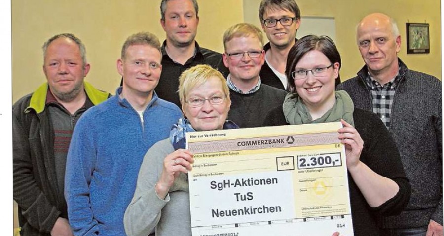 Bei der Scheckübergabe im Sportlerheim zeigten sich die Organisatoren mit dem Ergebnis zufrieden. „Absolut“, sagte der TuS-Vorsitzende Paul Escher: „Vor allem TuS intern hat richtig Gas gegeben.“ Bei der Vereinsmeisterschaft hatten die Organisatoren um Marielle Mittelberg, Christoph Rechtien, Stefan Wehinghaus, Stephan Krämer und Andreas Berens für ein attraktives Programm gesorgt. Die Zuschauer fühlten sich vom „Mega-Dart“-Wettbewerb gut unterhalten. Als erster Hallenkönig ging Pfarrer Heiner Zumdohme hervor. Auch die Tombola und der Tippwettbewerb trugen zum hervorragenden Erlös bei. Escher war mit der Resonanz zufrieden.