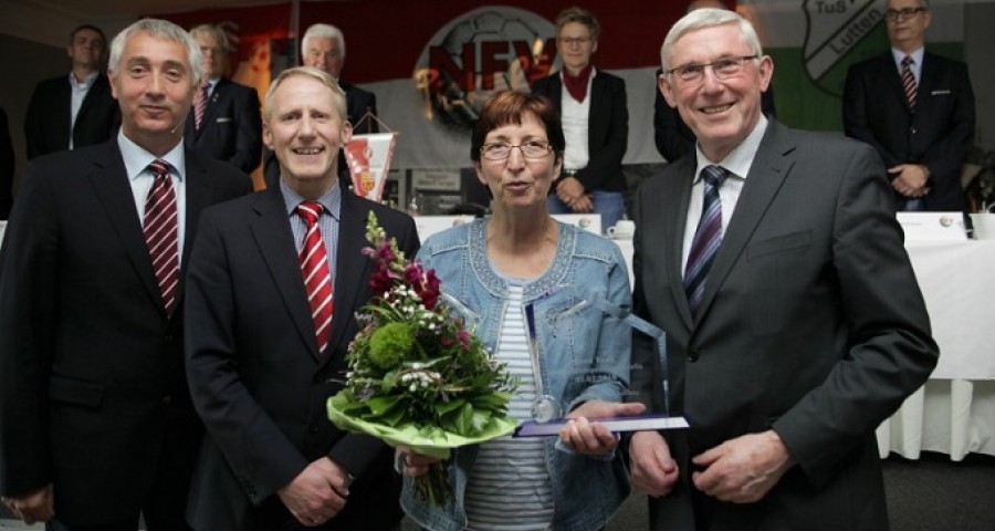 „Ehrungen sind ja nicht so mein Ding", meinte Gisela Vocke wie immer bescheiden, „aber ich finde es gut, dass auch Frauen solche Ehrungen erhalten. Dass ich es als erste bin, ist natürlich super." Seit 1991 war sie im Vorstand des TuS Neuenkirchen tätig: der Südkreisklub war übrigens Vorreiter bezüglich Frauen im Vorstand. Über 20 Jahre wirkte Gisela Vocke als Geschäftsführerin des Klubs, 40-Studen-Wochen bildeten da keine Ausnahme, sondern waren eher die Regel. Auch sonst war die „Mutter des TuS Neuenkirchen" überall aktiv, als Betreuerin, auf dem Sportgelände und im Vereinsheim sowie bei Veranstaltungen.
