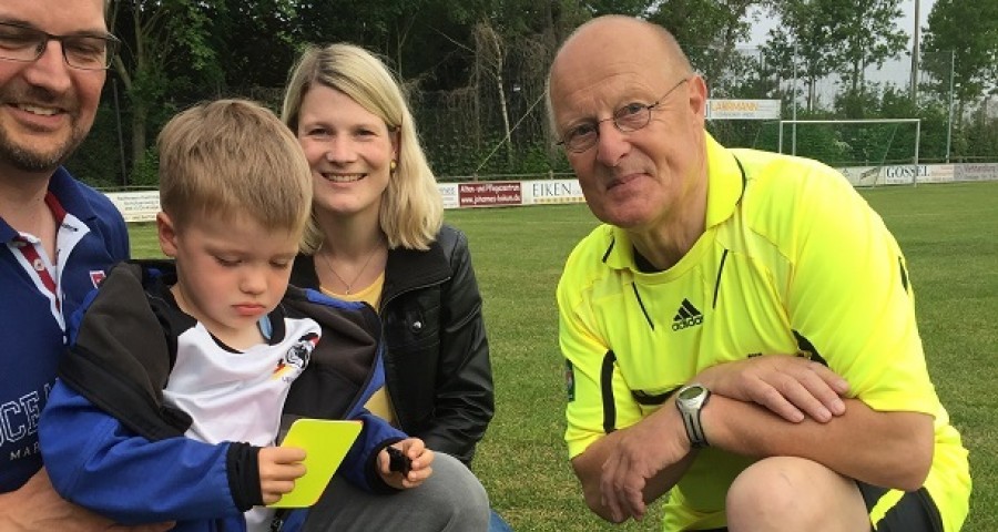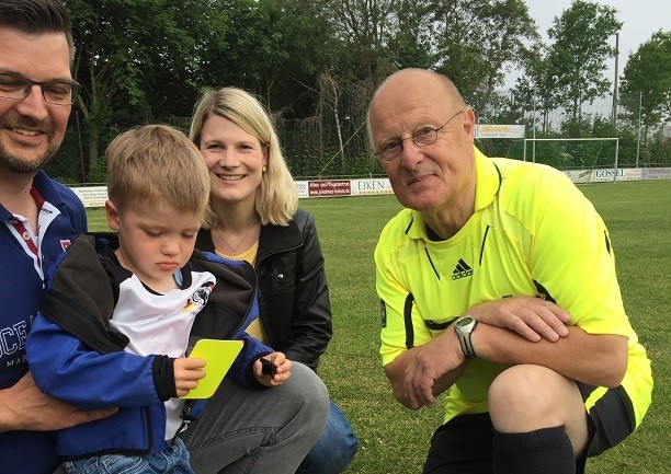 „Ich kannte den Jungen gar nicht. Er trug ein Deutschland-Trikot und war während des ganzen Spiels so bemüht. Wenn der Ball weg war, dann hat er ihn wiedergeholt", erzählt der Rentner. Da kam ihm noch während des Spiels die Idee, dem kleinen Theo aus Lüsche alle Utensilien zu schenken. „Das war für mich schon ein würdiger Abschluss", meinte Breuksch. Das fanden auch die Lüscher, die den Schiri extra noch mal für ein Erinnerungsfoto aus der Kabine holten.