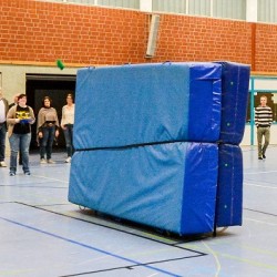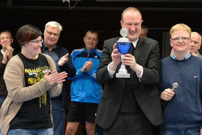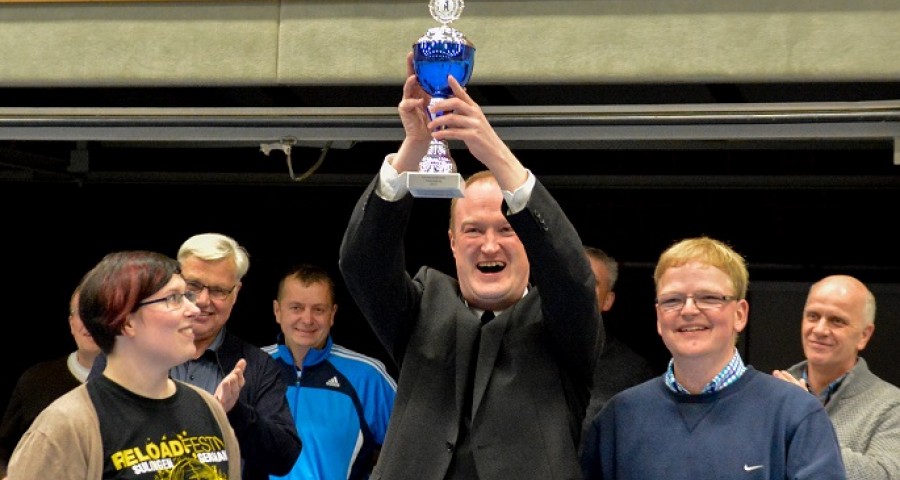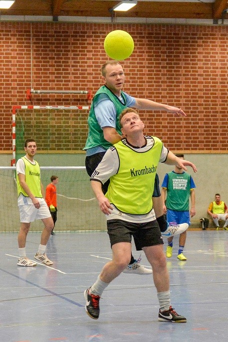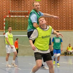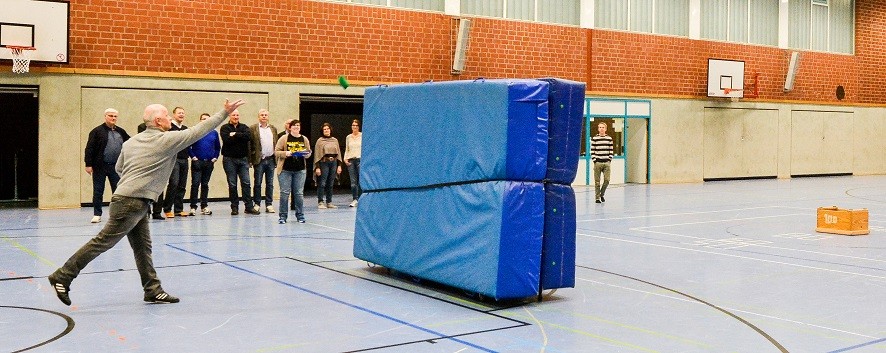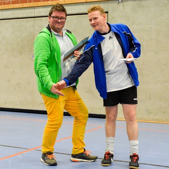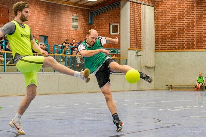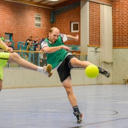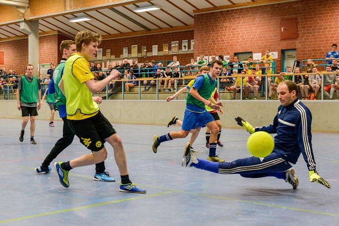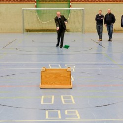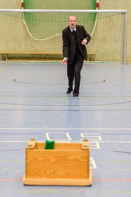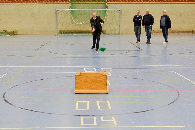 Früher war Neunmeterkönig beim Turnier für „Sportler gegen Hunger“. Jetzt forderte Mitorganisatorin Marielle Mittelberg die 13 prominenten Gönner und Freunde des Klubs überraschend zum „Mega-Dart“ auf. Auf dem Hallenparkett waren mehrere Felder mit den Punkten 50, 60 und 80 aufgezeichnet. in der Mitte stand ein Kasten mit 100 Punkten. Verdeckt hinter einer riesigen Turnmatte mussten die Promis einen kleinen Sandsack dreimal in die Felder werfen. Georg Weimer, Guido Oevermann, Friedhelm Biestmann und Heiner Zumdohme kamen jeweils auf 240 Punkte und qualifizierten sich fürs Stechen. In der ersten Runde schieden Weimer und Oevermann aus, so dass es zum Showdown zwischen dem früheren Landtagsabgeordneten und dem Pastor kam, die vor dem dritten Wurf gleichauf lagen. Dann traf Heiner Zumdohme, angefeuert von der voll besetzten Tribüne, wieder die Kante des Kastens, diesmal fiel der Sandsack aber hinein ins „Bulls Eye“. 100 Punkte, der knappe Sieg. Unter riesigem Applaus überreichte Marielle Mittelberg dem äußerst sympathischen Würdenträger den Wanderpokal, der neue Hallenkönig lud seine Mitstreiter spontan zum Umtrunk in der Cafeteria ein.