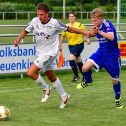 Im ersten Spiel des Tages kam der SC Rieste zu einem 2:1 gegen die Holdorfer. In den 45 Minuten gab es trotz der Hitze viel Tempo und Laufbereitschaft. Rieste führte nach vier Minuten durch Philipp Seggelmann mit 1:0, als er allein vor HSV-Keeper Björn Spiegler vollendete. Aber es ging weiter munter hin und her. Paul Bley erzielte nach 14 Minuten auf Vorlage von Thomas Mikulskij den Ausgleich. Danach parierte Spiegler gegen Seggelmann (21.). Schließlich entschied Lukas Liedmann in der 29. Minute die Partie mit dem 2:1, als die Holdorfer Abwehr auf Abseits spekuliert hatte. Kurz vor Schluss vergab Jonas Thölking noch eine Riesenchane zum möglichen Ausgleich.