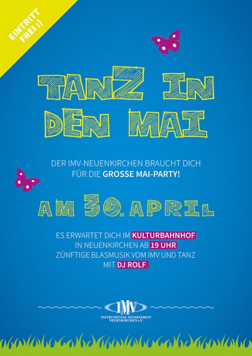Der IMV braucht dich für die große MAI-PARTY! Am 30. April 2016 erwartet dich im Kulturbahnhof in Neuenkirchen ab 19 Uhr zünftige Blasmusik vom IMV und Tanz mit DJ Rolf.