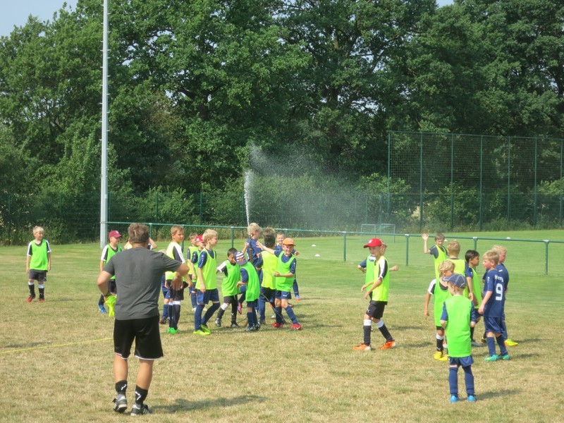 Neben technischen und koordinativen Übungen und Spielformen stand stets auch der Spaß im Vordergrund. Gerade bei den tropischen Temperaturen am Donnerstag durfte auch eine Abkühlung unter dem Rasensprenger nicht fehlen.