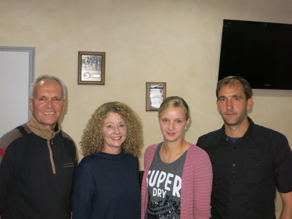 Reinhard Schwarze und Diana Maronde freuen sich den TuS Jugendleitern Theresa Escher und Sebastian Gude die Spende der Plattenspeelers Neuenkirchen zu überreichen.