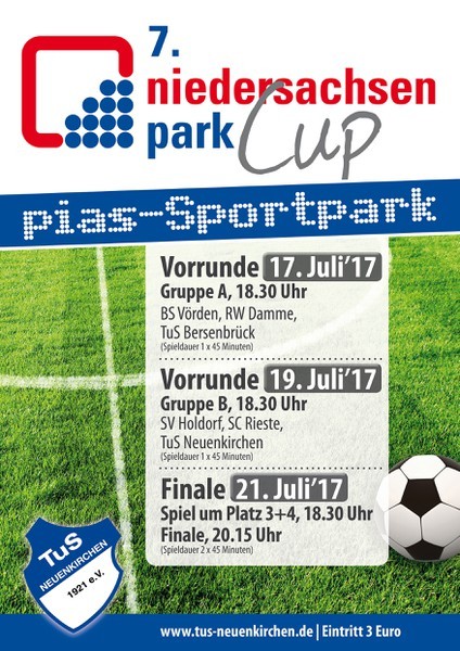 Der Niedersachsenpark-Cup in Neuenkirchen findet in diesem Jahr am Montag, 17., Mittwoch, 19., und Freitag 21. Juli, statt. Mannschaften der rund um den Niedersachsenpark ansässigen Vereine haben für die bereits siebte Auflage ihre Zusage gegeben. Der Eintritt kostet 3 Euro, Infos zum Turnier gibt es auch online unter www.tus-neuenkirchen.de