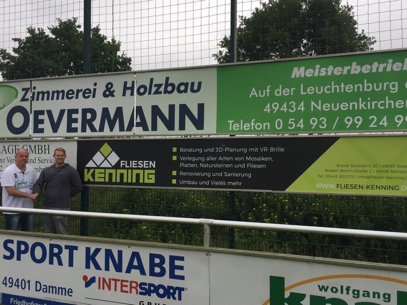 Am Wochenende wurde eine weitere Werbebande im pias-Sportpark installiert. Als neuer Werbepartner konnte die Firma Fliesen Kenning, Stickteich 20, 49597 Rieste und Robert-Bosch-Str. 2, 49406 Barnstorf gewonnen werden.