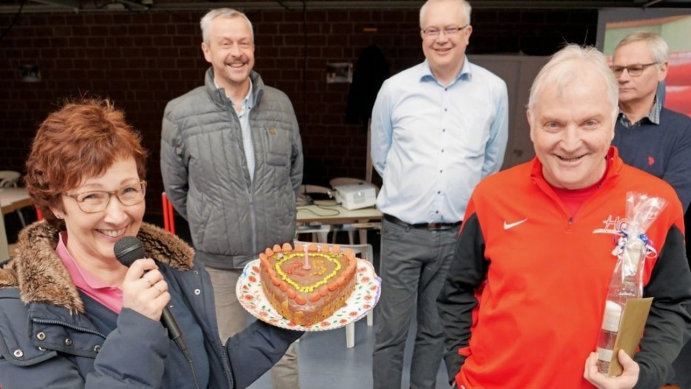 Den von Kindern gebackenen Jubiläumskuchen überreichte Barbara Hülsmann an Organisator Klaus Buschermöhle. Im Hintergrund (von links): Josef Futtermann vom Förderverein der Heimstatt Clemens August, Bürgermeister Ansgar Brockmann und Mitorganisator Helmut Hilgefort.