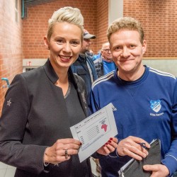 „Von nix kommt nix.“. Ein Sprichwort, das in Südoldenburg dauerhaft Hochkonjunktur hat. Eine Lebenseinstellung, die die Südoldenburger in ihrer DNA tragen. Lange drum rum reden bringt nichts – dieses Motto gilt auch für „Sportler gegen Hunger“: Zig Personen packten auch am Wochenende wieder für die OV/KSB-Aktion an. Eine davon war Silvia Breher. Als die Bundestagsabgeordnete (CDU) aus Löningen am Samstag um 17.00 Uhr als Ehrengast gerade die Halle an der Neuenkirchener Oberschule betreten hatte, ging`s nach kurzer Begrüßung gleich ans Werk: Zusammen mit Christoph Rechtien sammelte sie auf der Tribüne Tipps für das Tore-Tippspiel bei der internen Champions League des TuS Neuenkirchen. Der Einsatz aller Beteiligten lohnte sich – durch Startgeld, Tombola, Cafeteria, Spenden und Tore-Tippspiel kamen 2051 Euro für SgH zusammen.