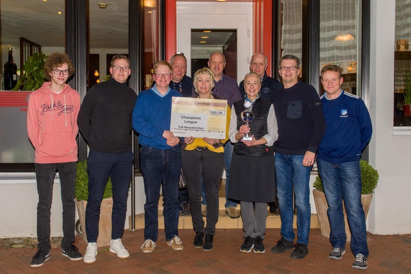 Ines La Rocca strahlte auch rund drei Wochen später wieder übers ganze Gesicht. Als sich die Organisatoren der 12. Champions League des TuS Neuenkirchen bei ihr in der Pizzeria Bodini zur gemütlichen Nachbesprechung trafen, präsentierte die neue Hallenkönigin stolz ihren Pokal. Stolz war aber auch die Orga-Crew: 2051 Euro spendete sie an „Sportler gegen Hunger“.