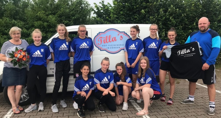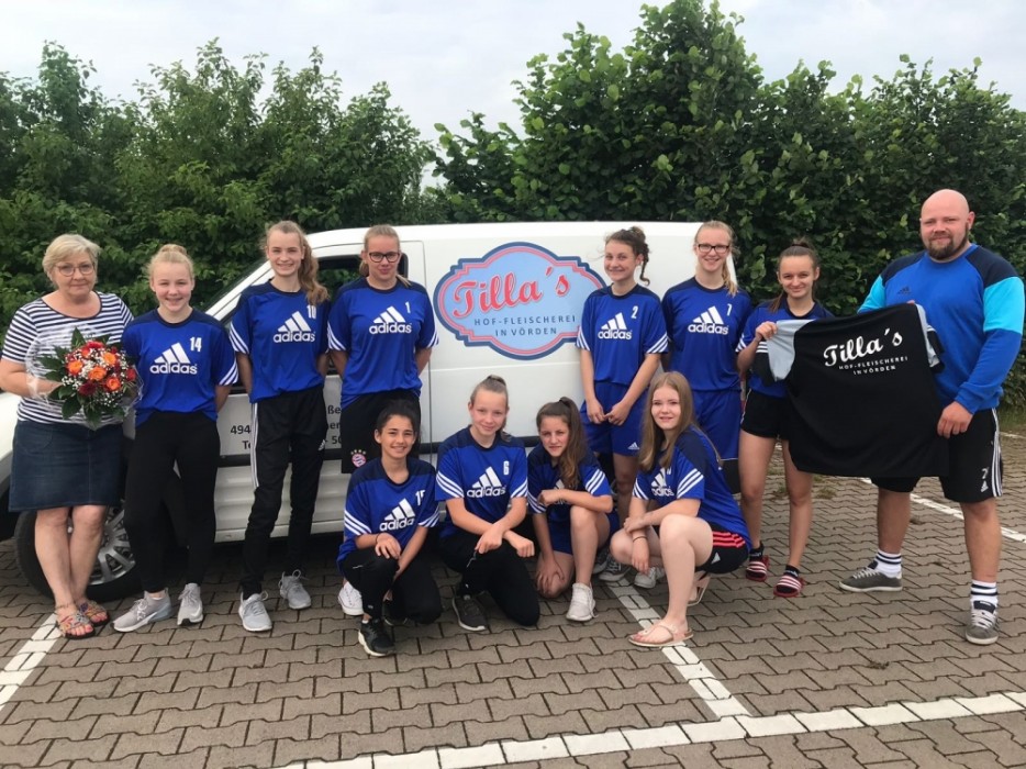Die C-Juniorinnen mit ihrem Trainer Christian Frye wurden mit neuen Aufwärmshirts ausgestattet. Die Mannschaft bedankt sich recht herzlich bei Tilla`s Hoffleischerei (Inh. Mathilde Frye), Schillerstr. 2, 49434 Neuenkirchen-Vörden.
