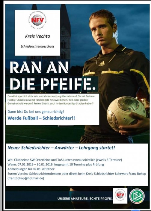 Interessierte Personen des TuS Neuenkirchen können sich bis zum 30.12.2018 beim Schiedsrichterobmann des Vereins Frank Middendorf (Tel. 0151 29109622) melden.