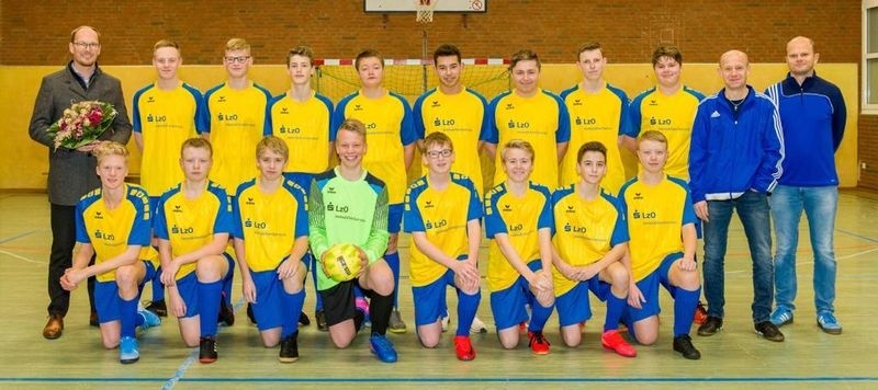 Die 2. B-Jugend der Spielgemeinschaft Neuenkirchen-Vörden hat einen Satz neuer Trikots erhalten. Das Team mit ihren Trainern Hubert Middendorf und Martin Hülsmann bedankt sich ganz herzlich bei der LzO Immobilienservice als Sponsor, vertreten durch Holger Ening.
