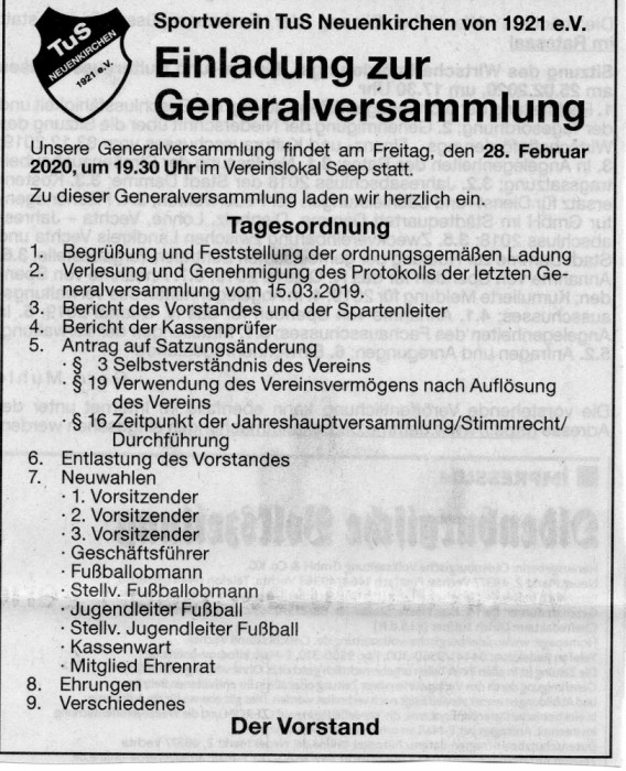 Der Vorstand des TuS Neuenkirchen bittet um rege Beteiligung.