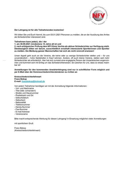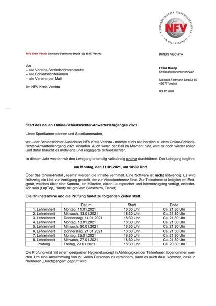 Der Schiedsrichter Ausschuss des NFV Vechta bietet ab dem 11.01.2021 einen Online-Anwärterlehrgang an.