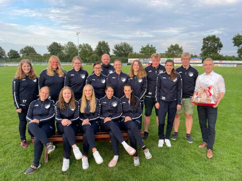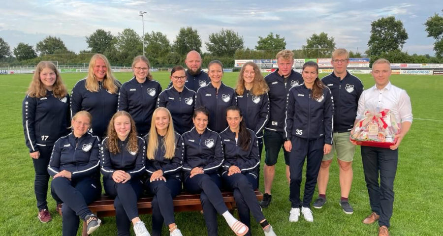 Die Mannschaft der Damen mit ihren neuen Trainingsanzügen, rechts Sponsor Julian Brokamp