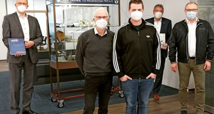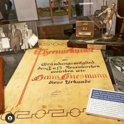In einer Vitrine werden Fundstücke aus der 100‐jährigen Vereinshistorie präsentiert. „ Wir haben versucht, aus allen zehn Jahrzehnten etwas zu zeigen“, so David Kreutzmann . Zu sehen sind unter anderem alte Fußballschuhe, Trikots sowie Fotos und Plakate bis hin zur Gründungszeit des TuS. Aber auch einige Kuriositäten haben ihren Platz in der Vitrine gefunden, beispielweise ein Kopfballpendel, das viele Jahre in Neuenkirchen seine Verwendung fand, oder eine Sportzigarette aus dem Museum des VfL Osnabrücks.