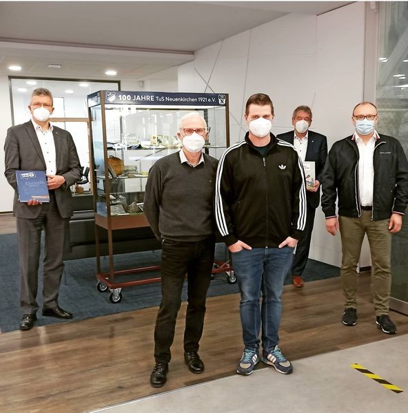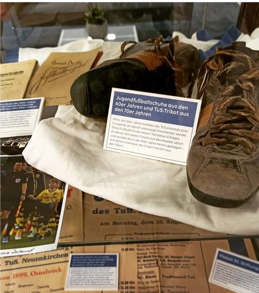 In einer Vitrine werden Fundstücke aus der 100‐jährigen Vereinshistorie präsentiert. „ Wir haben versucht, aus allen zehn Jahrzehnten etwas zu zeigen“, so David Kreutzmann . Zu sehen sind unter anderem alte Fußballschuhe, Trikots sowie Fotos und Plakate bis hin zur Gründungszeit des TuS. Aber auch einige Kuriositäten haben ihren Platz in der Vitrine gefunden, beispielweise ein Kopfballpendel, das viele Jahre in Neuenkirchen seine Verwendung fand, oder eine Sportzigarette aus dem Museum des VfL Osnabrücks.