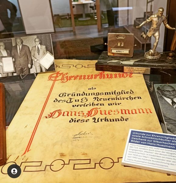 „Bei der Arbeit an unserer Chronik sind uns einige Fundstücke der TuS‐Vereinsgeschichte in die Hände gefallen, die wir auf diesem Weg gerne zeigen möchten“, sagte David Kreutzmann bei der Ausstellungseröffnung. Zusammen mit seinem Vater Karl‐Heinz „Charly“ Kreutzmann hat er die Idee einer Dauerausstellung verwirklicht. Diese widmet sich im Gegensatz zur Chronik einzig der Fußballabteilung, die insbesondere die Anfangsjahre des TuS geprägt hat.