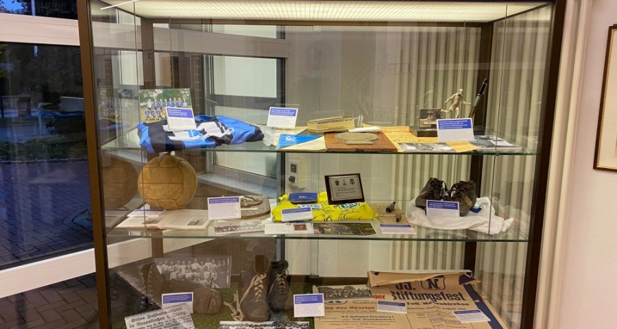 Aufgrund des 100-jährigen Bestehen des TuS Neuenkirchen wurde eine Vitrine mit Fundstücken aus der 100-jährigen Vereinshistorie zusammengestellt.