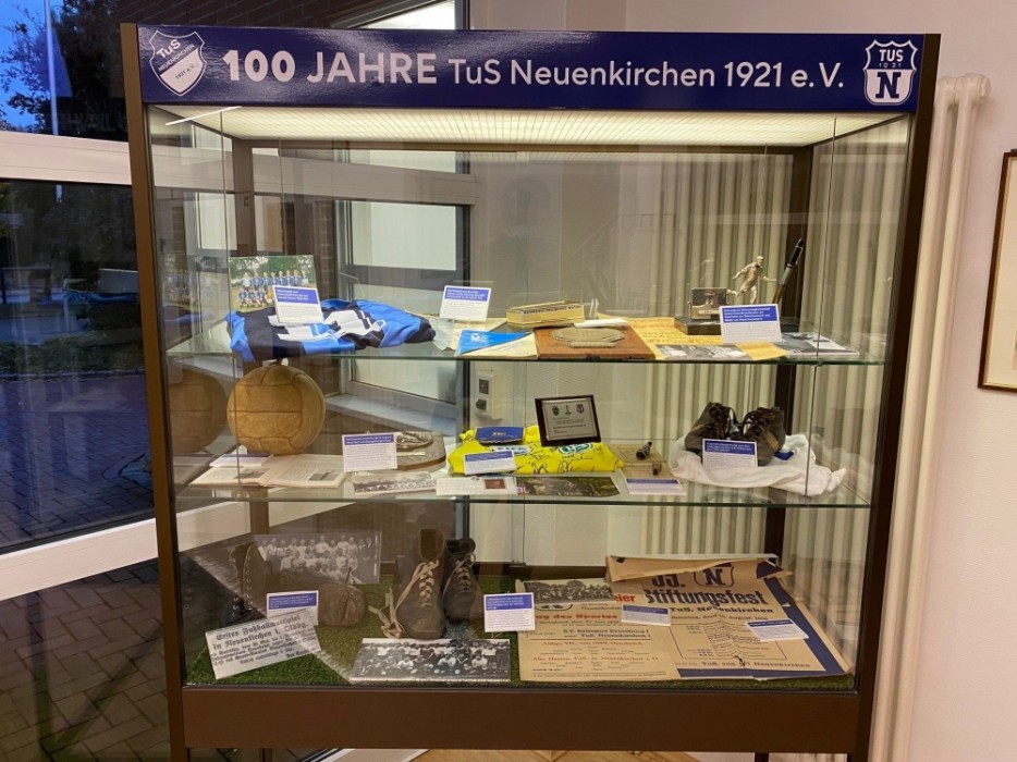 Aufgrund des 100-jährigen Bestehen des TuS Neuenkirchen wurde eine Vitrine mit Fundstücken aus der 100-jährigen Vereinshistorie zusammengestellt.