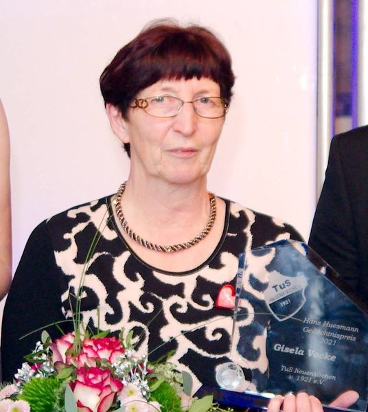 Die höchste Auszeichnung des TuS Neuenkirchen, der Hans Huesmann Gedächtnispreis, wurde an Gisela Vocke verliehen. In ihrer langen Laufbahn im TuS Neuenkirchen habe sie den Verein in vielen Positionen und Ämtern unterstützt, freute sich Andreas Menke in seiner Laudatio. Gisela Vocke war als Jugendbetreuerin aktiv, hat als Geschäftsführerin gearbeitet und wurde in der Vergangenheit bereits zur Sportlerin des Jahres gewählt. Gisela Vocke wurde 2016 als erste Frau mit der höchsten Auszeichnung des Niedersächsischen Fußballverbandes im Kreis Vechta, dem Gerd-Tank-Preis, geehrt. Dabei wurde sie als „Mutter des TuS Neuenkirchen“ bezeichnet.