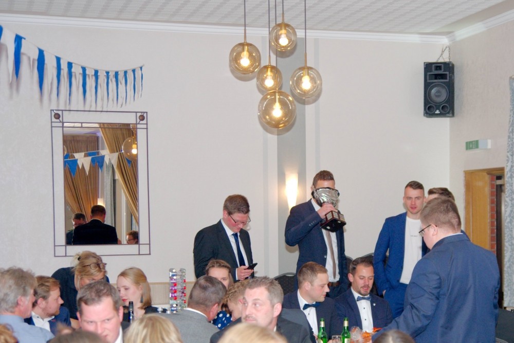Volker Rechtien wurde an diesem Abend selbst auch geehrt. Zusammen mit David Kreutzmann wurde ihm die Blau-Weiße-Trophäe verliehen. Die beiden haben zum 100-jährigen Vereinsjubiläum eine 392 Seiten starke Vereinschronik erstellt. Frank Schlarmann bezeichnte das Werk in seiner Lobrede als „Meisterwerk“, dass seinesgleichen suche und in jeden Neuenkirchener Haushalt gehöre. Frank schloss seine Rede mit den Worten: „Wir danken euch für den phänomenalen Einsatz und eure Energie, die ihr da reingesteckt habt.“