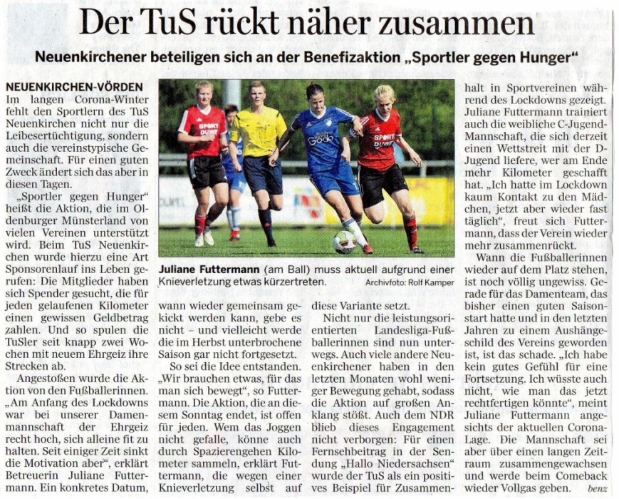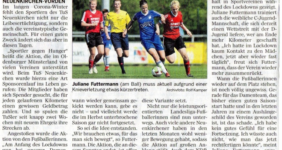 Auch bei den Bramscher Nachrichten sorgte die Aktion "Sportler gegen Hunger" für Aufsehen. In der Ausgabe vom 27.02.2021 wird von dem Sponsorenlauf des TuS berichtet, welcher von der 1. Fußball-Damenmannschaft des Vereins organisiert wurde.
