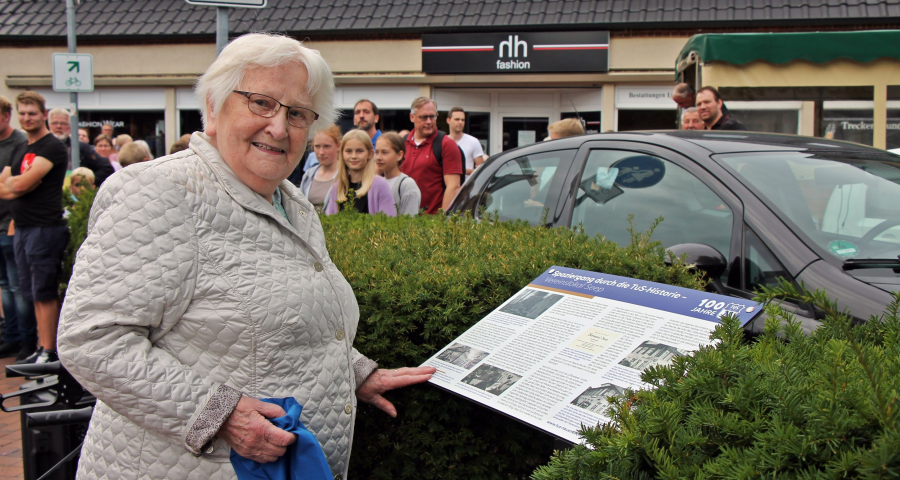 Abgerundet wurde der Tag im Biergarten der Gastwirtschaft „Zum Schwarzen Ross“. Emotional wurde es bei der 5. Zwischenstation des Tages. Seit 1955 war die Gaststätte Seep das Vereinslokal des TuS Neuenkirchen und Wirtin Regina Bye die „Seele“ des Vereins. Ihr war es natürlich auch vorenthalten, die Infotafel des langjährigen Vereinslokals zu enthüllen. Mit Tränen in den Augen stand sie minutenlang vor „ihrer Tafel“ und schwelgte in Erinnerungen. Nur ein Beleg von vielen, wie bewegend und wichtig die TuS-Historie für den einen oder anderen Neuenkirchener doch ist.