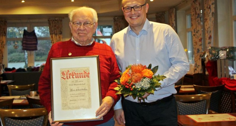 Präsident Andreas Menke überreichte ihm die Ehrennadel, eine Urkunde und einen Blumenstrauß.