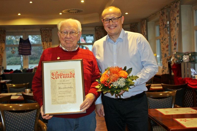 Für seine 75-jährige Mitgliedschaft wurde bei einer Kaffeetafel in der Gaststätte „Zum Hollotal“ Hans „Hansi“ Kleinebrahm geehrt.