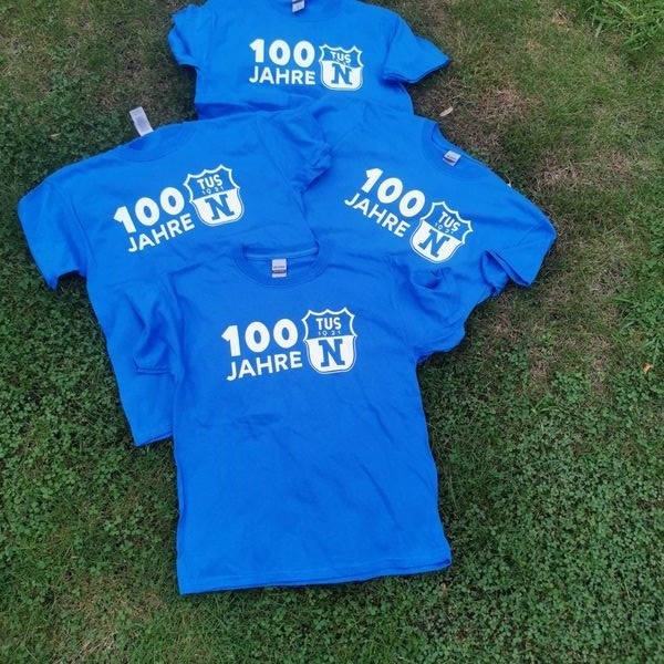 blauen Shirts, bedruckt mit dem Logo des 100jährigen Jubiläums, verteilt.