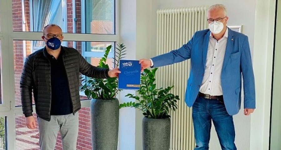 Der Vorsitzende des Turn- und Sportvereins Neuenkirchen e.V., Andreas Menke, überreichte Herrn Bürgermeister Ansgar Brockmann die zum 100-jährigen Geburtstag des Vereins herausgebrachte Chronik.