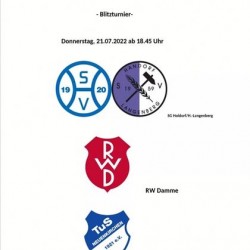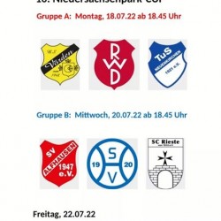 In der Vorrunden-Gruppe A spielen am 18. Juli (Montag) ab 18.45 Uhr BS Vörden, RW Damme und der Gastgeber TuS Neuenkirchen drei Spiele a 45 Minuten. Das Gleiche machen der SV Alfhausen, SV Holdorf und SC Rieste am 20. Juli (Mittwoch). Die Finals am 22. Juli (Freitag) gehen über die volle Distanz.
