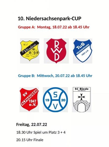 In der Vorrunden-Gruppe A spielen am 18. Juli (Montag) ab 18.45 Uhr BS Vörden, RW Damme und der Gastgeber TuS Neuenkirchen drei Spiele a 45 Minuten. Das Gleiche machen der SV Alfhausen, SV Holdorf und SC Rieste am 20. Juli (Mittwoch). Die Finals am 22. Juli (Freitag) gehen über die volle Distanz.