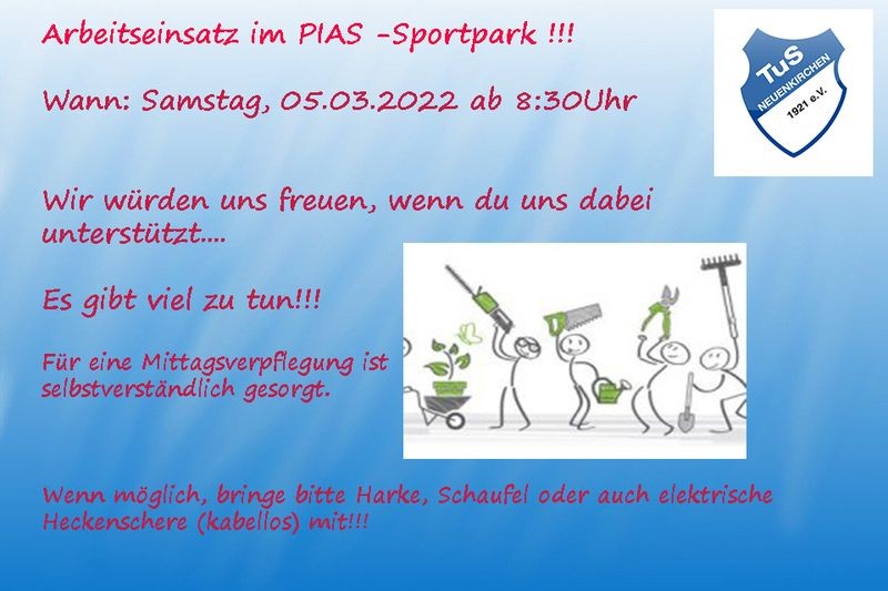Im Hinblick auf den OM-Cup (02./03.07.2022) soll ein erster, großer Arbeitseinsatz im PIAS-Sportpark gestartet werden.