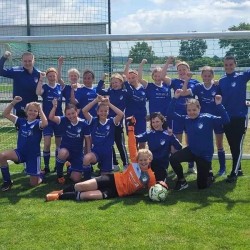 Strahlende Gesichter gab es dann nicht nur auf dem gemeinsam geschossenen Foto, sondern auch aus sportlichen Gründen. Nach einer starken Teamleistung konnte die Mannschaft anschließend einen 3:0 Sieg gegen den SV Bethen feiern. Ein rundum gelungener Tag für unsere Nachwuchskickerinnen.