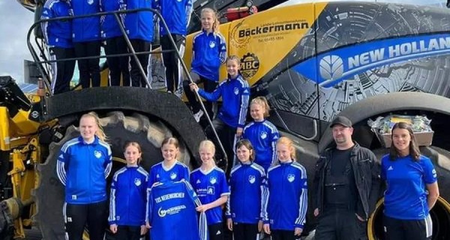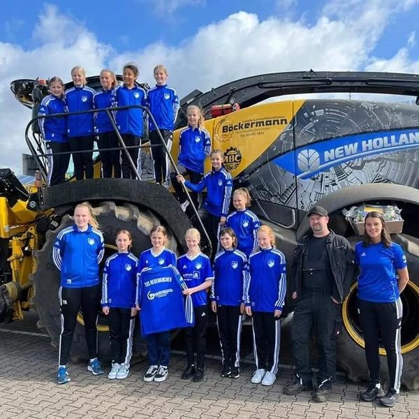 Mit einem Geschenkkorb und einem großen Applaus bedankt sich die D-Mädchenmannschaft bei Christoph Böckermann, Inhaber des Lohnunternehmens Böckermann, für die tollen neuen Trainingsanzüge!