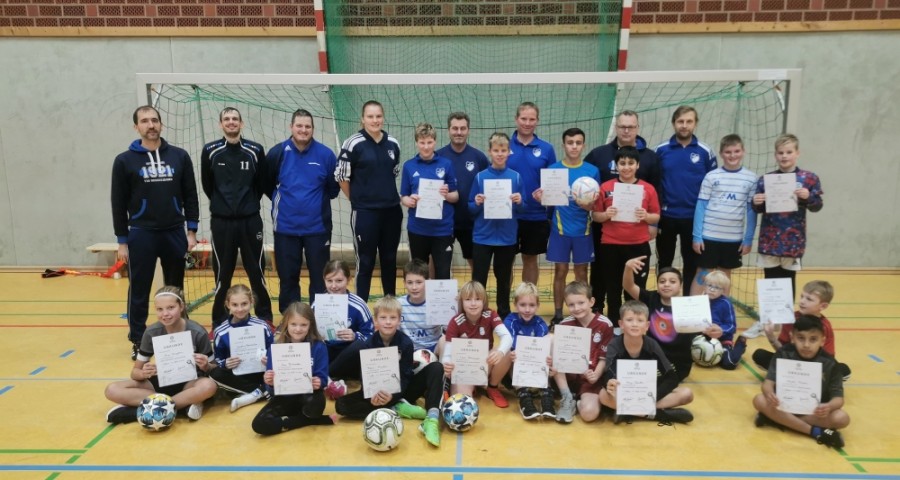 Das Foto zeigt einen Teil der Kinder, die nachmittags das DFB-Fußball Abzeichen erreicht haben und die Betreuer, die die Aktion betreut haben.