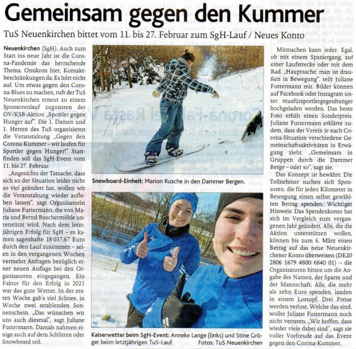 Auch zum Start ins neue Jahr ist die Corona-Pandemie das herrschende Thema. Omikron hier, Kontaktbeschränkungen da. Es hört nicht auf. Um etwas gegen den Corona-Blues zu machen, ruft der TuS Neuenkirchen erneut zu einem Sponsorenlauf zugunsten der OV/KSB-Aktion „Sportler gegen Hunger AUF2: Die 1. Damen und 1. Herren des TuS organisieren die Veranstaltung „Gegen den Corona-Kummer - wir laufen für Sportler gegen Hunger!“ Stattfinden soll das SgH-Event vom 11. Bis 27. Februar.