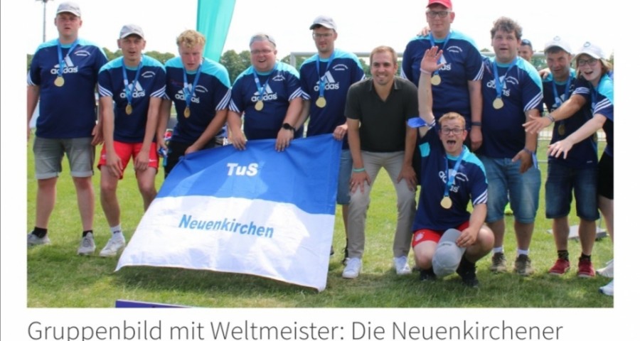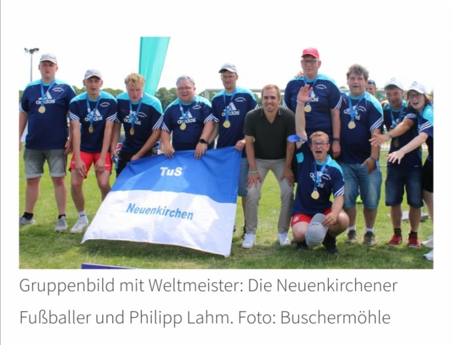 Gruppenbild mit Weltmeister: Die Neuenkirchener Fußballer und Philipp Lahm. Foto: Buschermöhle