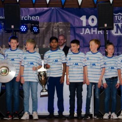 Die letztjährige Mannschaft der E1 Fußballjugend wurde anschließend für ihren Sieg beim OM-Cup 2022 auf die Bühne gebeten und lautstark gefeiert. Sie hatte als erste Mannschaft in der 23-jährigen Geschichte als Ausrichter die begehrte Trophäe gewonnen.