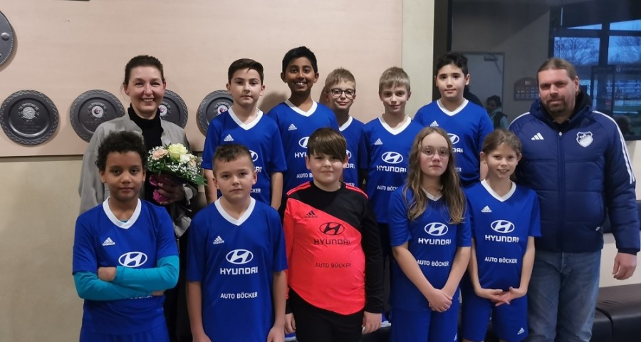 einen neuen Trikotsatz! Stolz präsentierten die Spielerinnen und Spieler beim Fotoshooting ihr neues Outfit. Jugendleiter Sebastian Gude und Frank Eggert, Trainer der E4 bedanken sich bei Frau Böcker für die