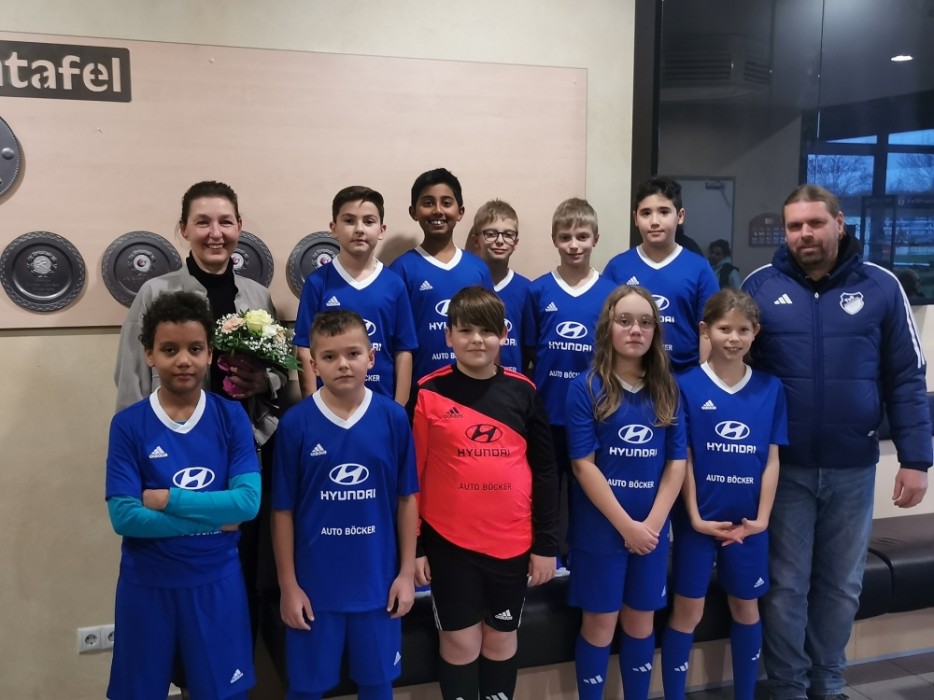 einen neuen Trikotsatz! Stolz präsentierten die Spielerinnen und Spieler beim Fotoshooting ihr neues Outfit. Jugendleiter Sebastian Gude und Frank Eggert, Trainer der E4 bedanken sich bei Frau Böcker für die