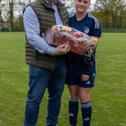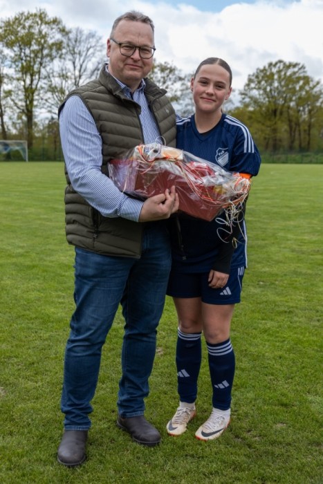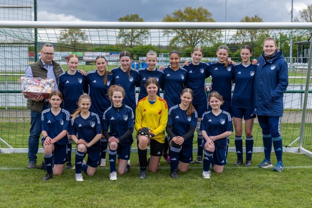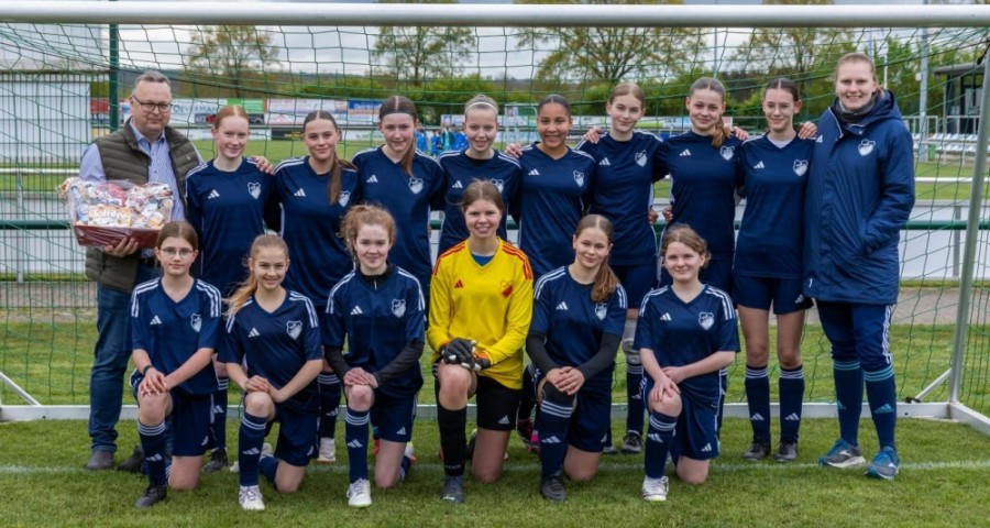 Seit einigen Monaten ist die Mannschaft nun schon im neuen Outfit aktiv und konnte mit der Qualifikation zur Hallenendrunde und einem aktuell starken zweiten Tabellenplatz bereits einige Erfolge feiern. Nun bedankte sich die Mannschaft um Kapitänin Lina nach dem 2:0 Sieg gegen Ermke mit einem Präsentkorb bei Karsten.