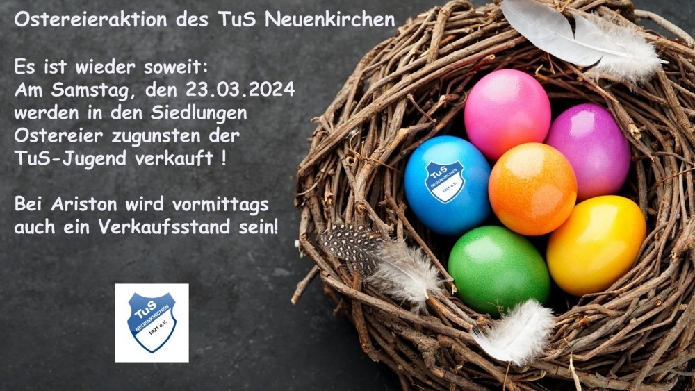 Am Samstag, den 23.03.2024 werden in den Siedlungen Ostereier zugunsten der TuS-Jugend verkauft!