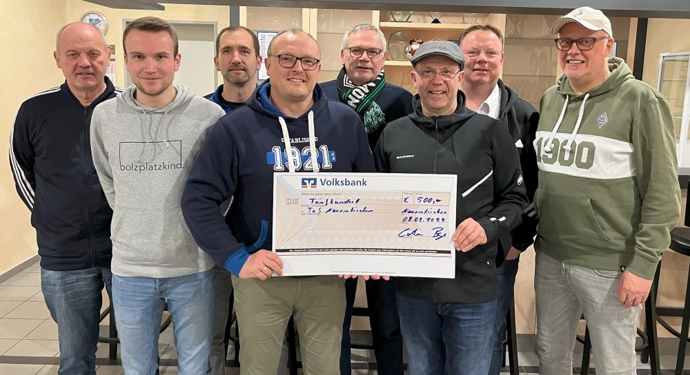 Die Krebsbach-Fohlen spendeten nicht nur den Überschuss der Einnahmen des Fußballspiels der Weisweiler-Elf in Neuenkichen, sondern hatten noch einen 500-Euro-Scheck für den TuS Neuenkirchen parat.